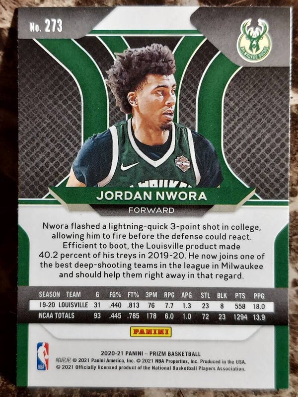 FCC BASKETBALL 2020-21 Panini Prizm Jordan Nwora Rookie RC - Milwaukee Bucks