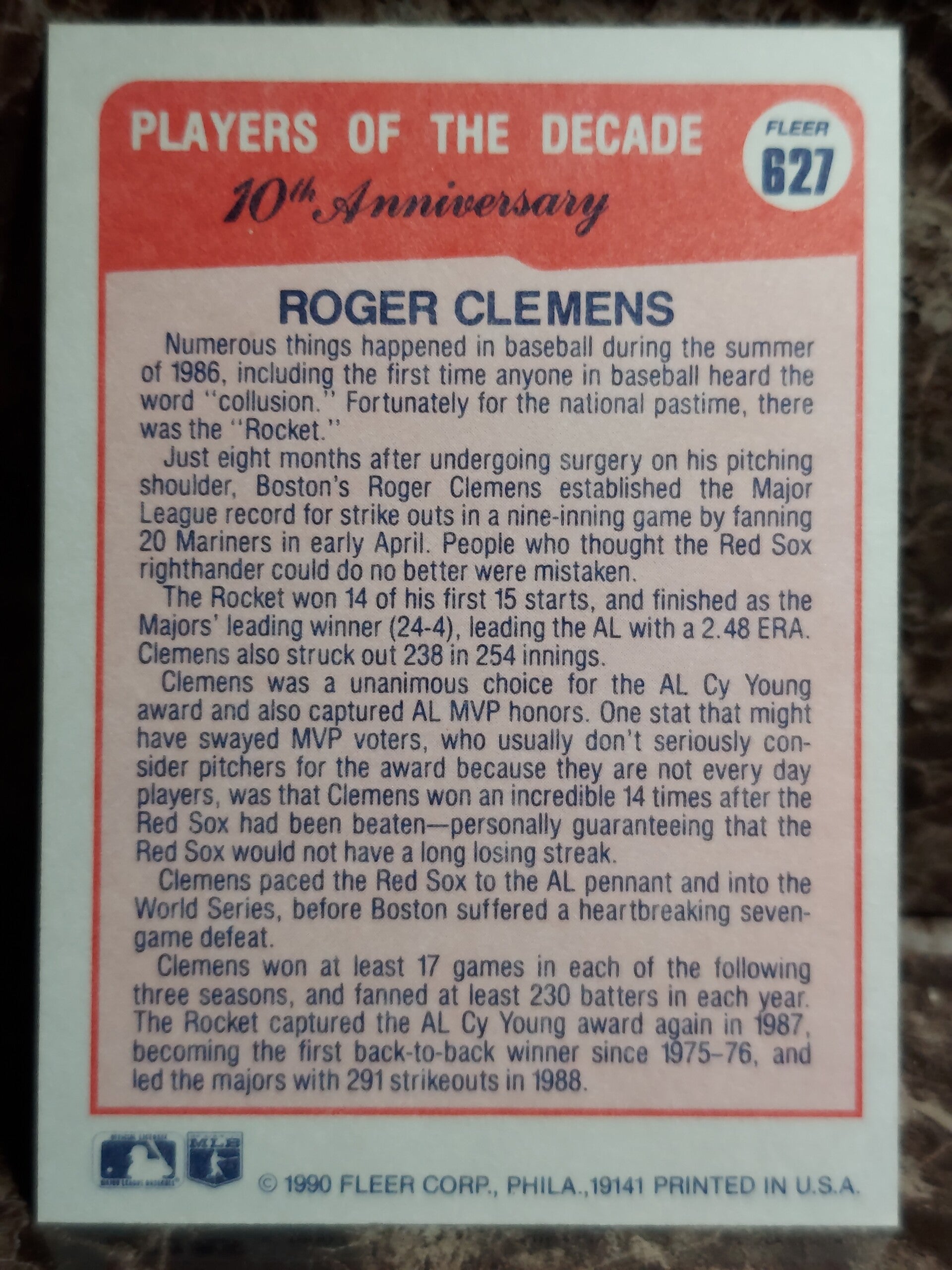 FCC 1990 Fleer 10th Anniversary Players of the Decade Roger Clemens # 627 Boston