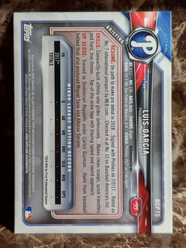 FCC 2018 BOWMAN CHROME 1ST CARD RC LUIS GARCIA PHILADELPHIA PHILLIES S3440-3
