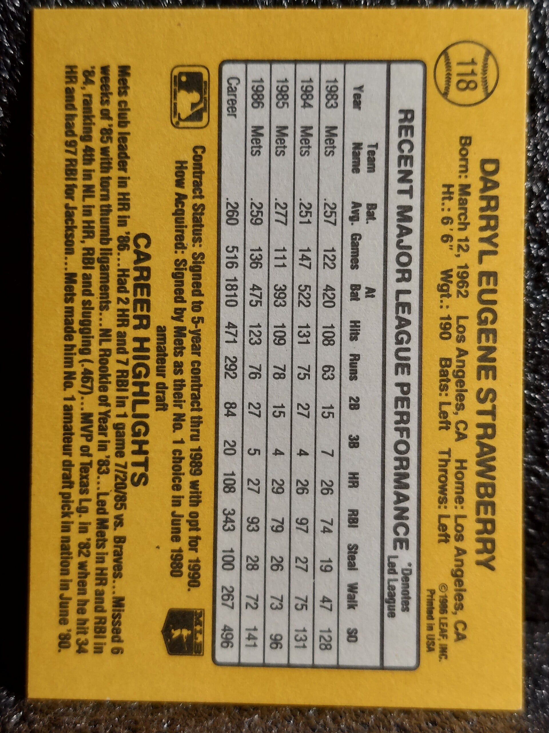 FCC Card Darryl Strawberry 1987 Donruss New York Mets #68.