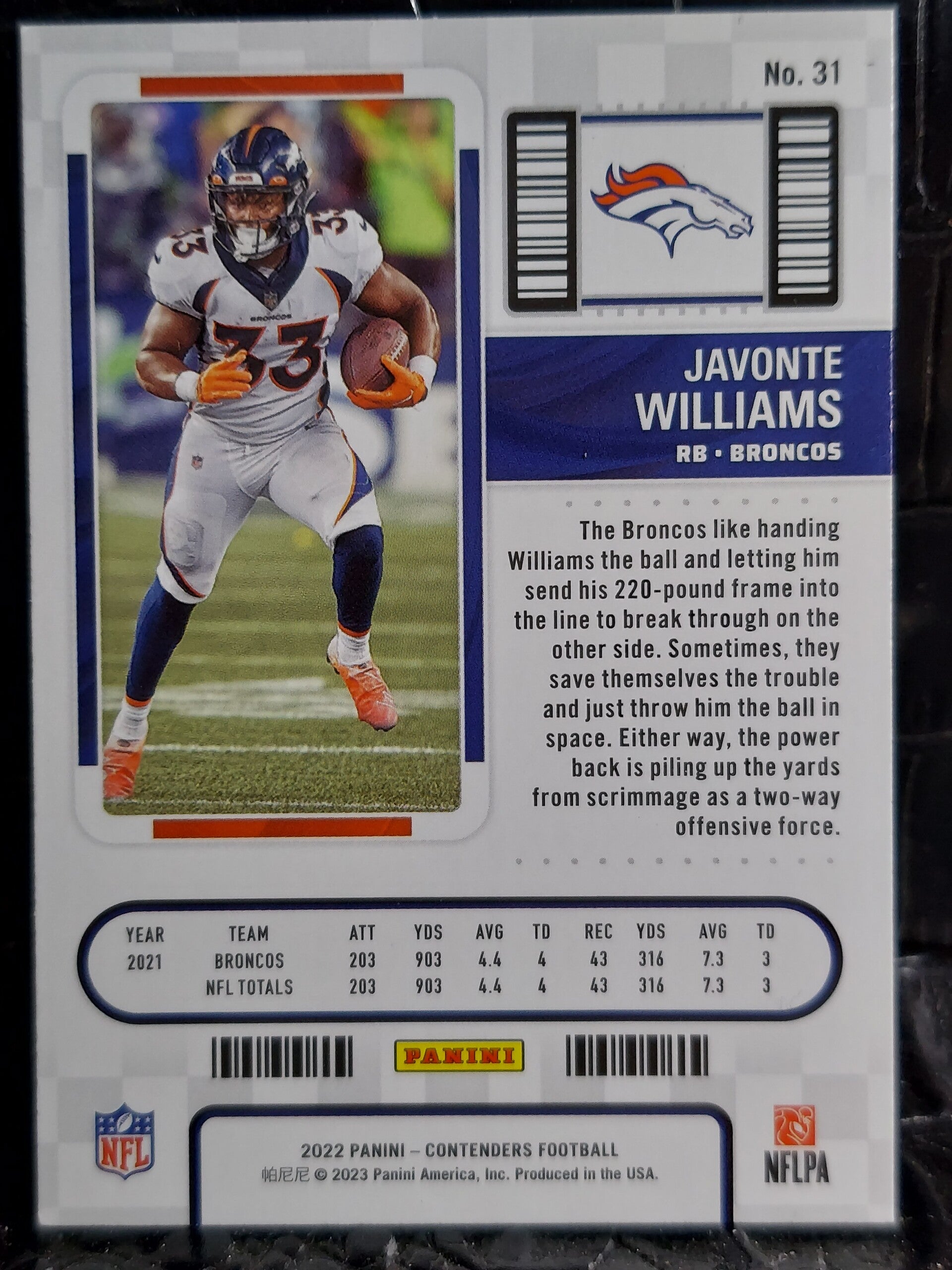 2022 Panini Contenders Season Ticket football card featuring Javonte Williams of the Denver Broncos