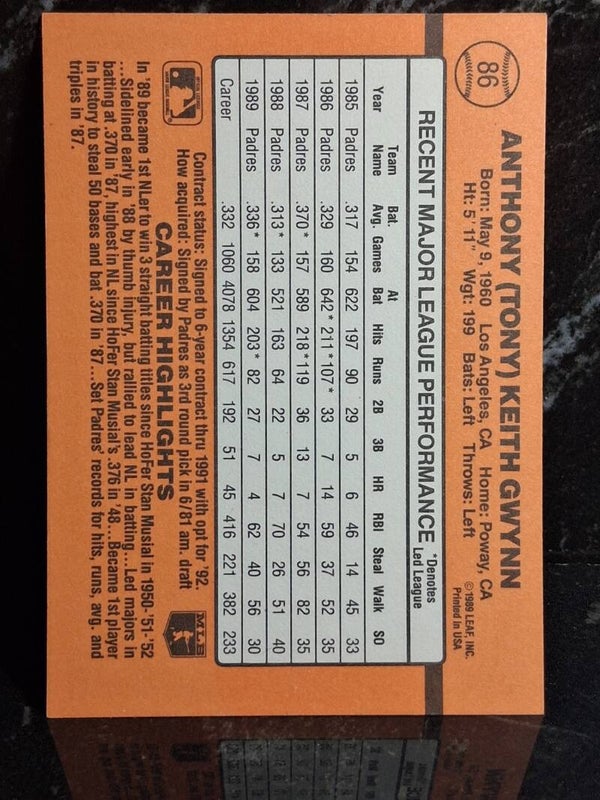 1990 Donruss #86 Outfielder Tony Gwynn San Diego Padres Baseball Card