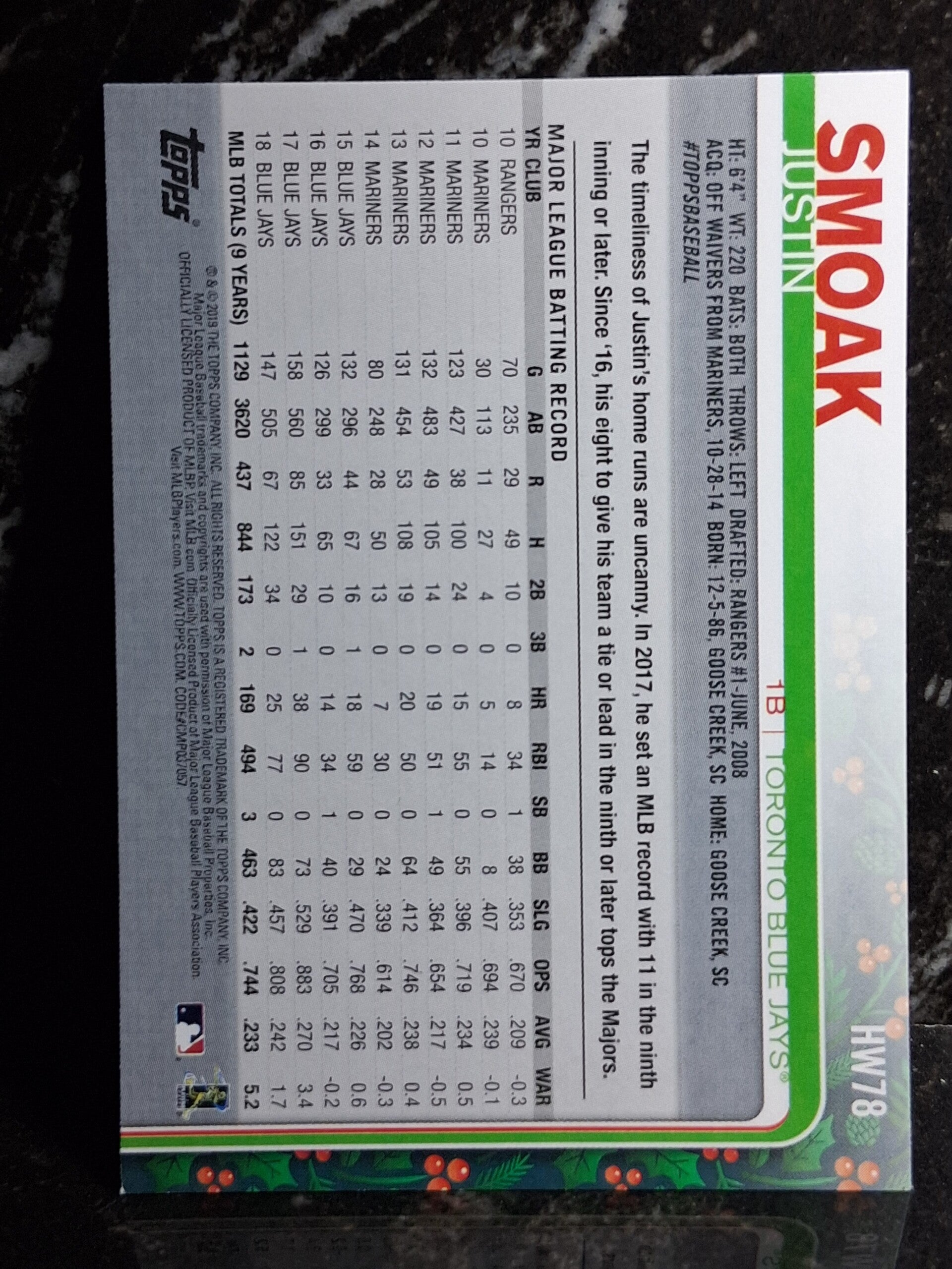 2019 Topps Holiday #HW78 Justin Smoak Toronto Blue Jays Baseball Card
