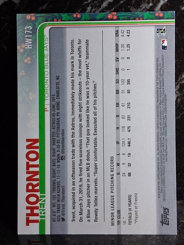 2019 Topps Holiday HW173 Trent Thornton Toronto Blue Jays RC Baseball Card