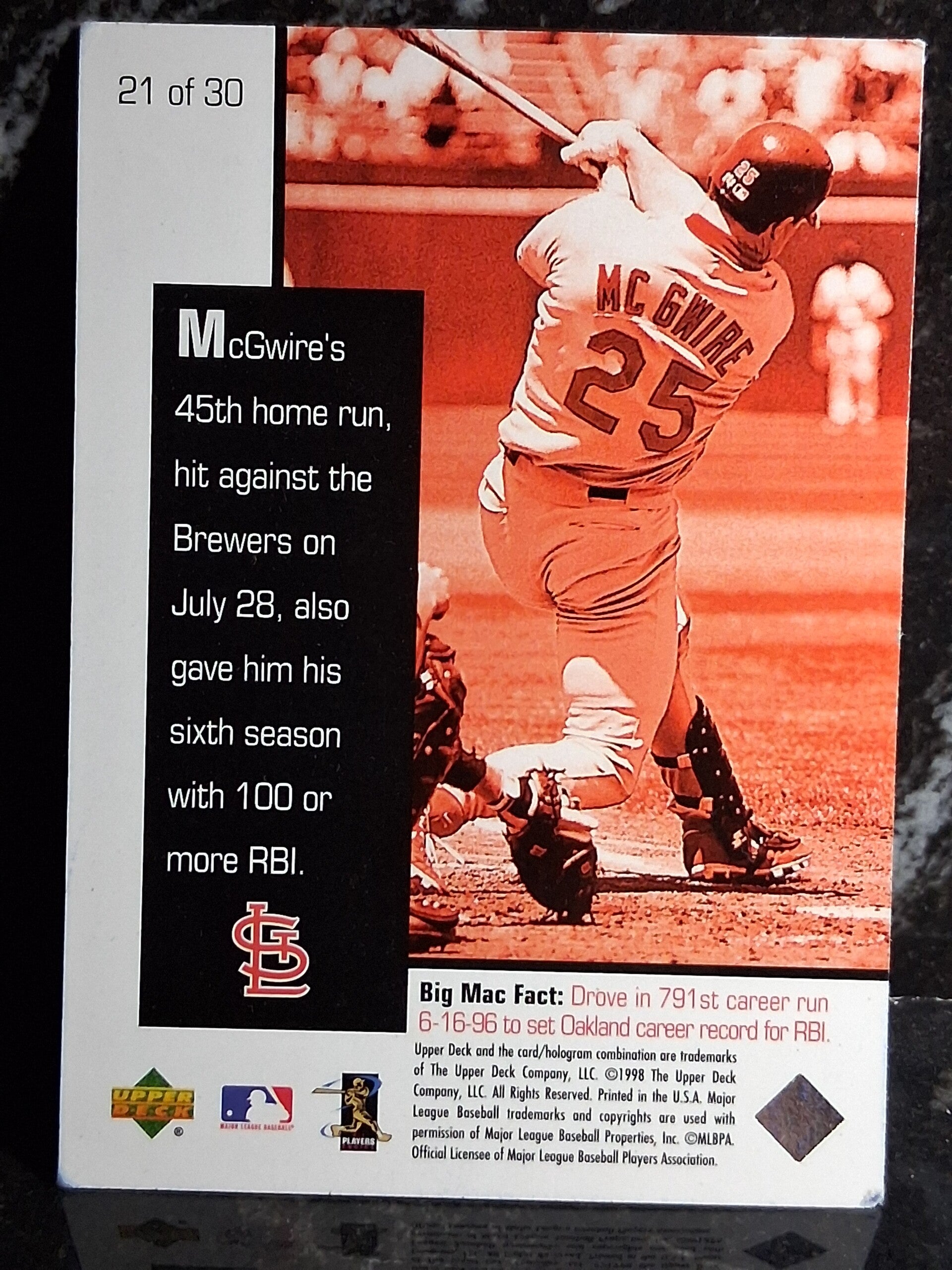 1998 Upper Deck Mark McGwire's Chase for 62 #21 45th Home Run