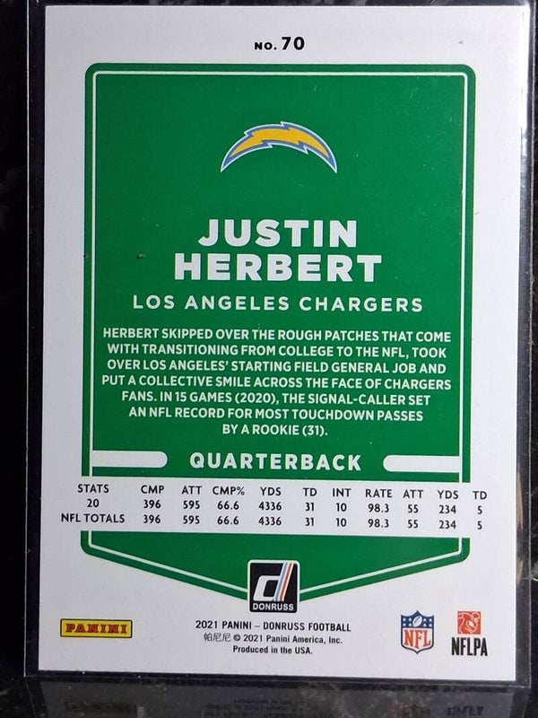 2021 Panini Donruss #70b NFL Quarterback Justin Herbert No Helmet Los Angeles Chargers Football Card