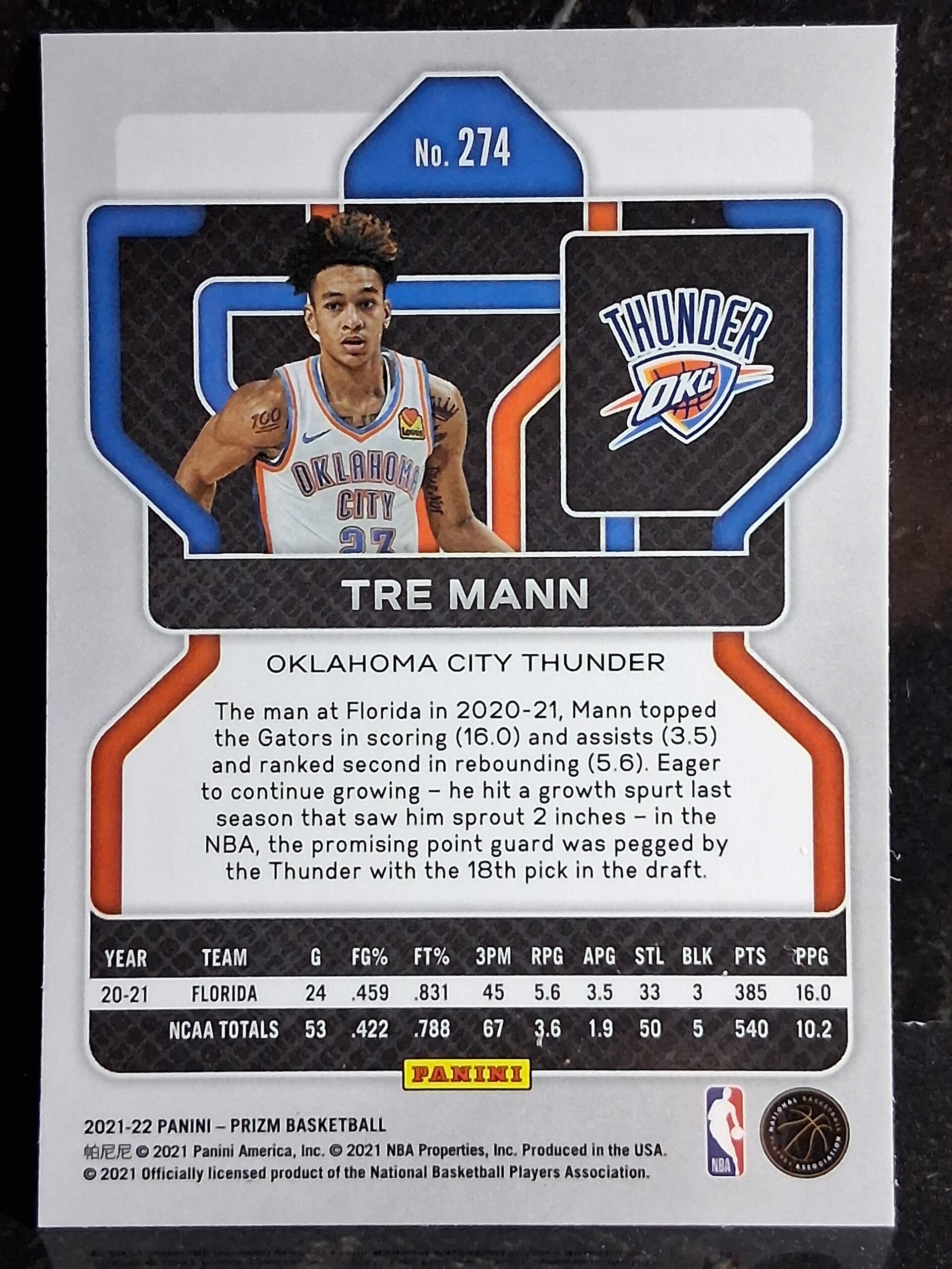 2021-22 Panini Prizm NBA Point Guard Tre Mann #274 Oklahoma City Thunder Basketball Rookie Card