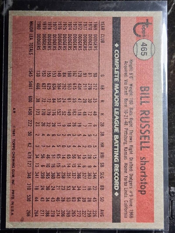 1981 Topps #465 Bill Russell Los Angeles Dodgers