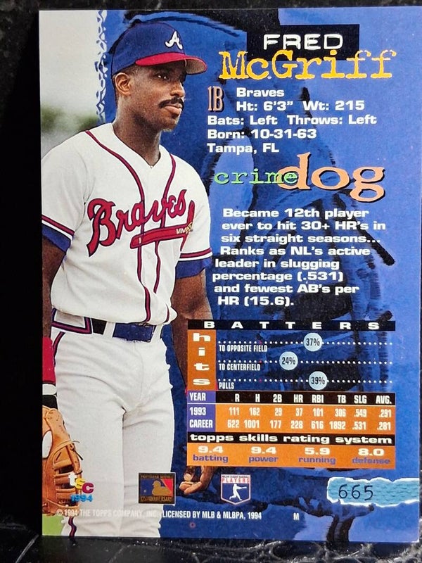 1994 Topps Stadium Club Fred McGriff #665 Atlanta Braves Baseball Card