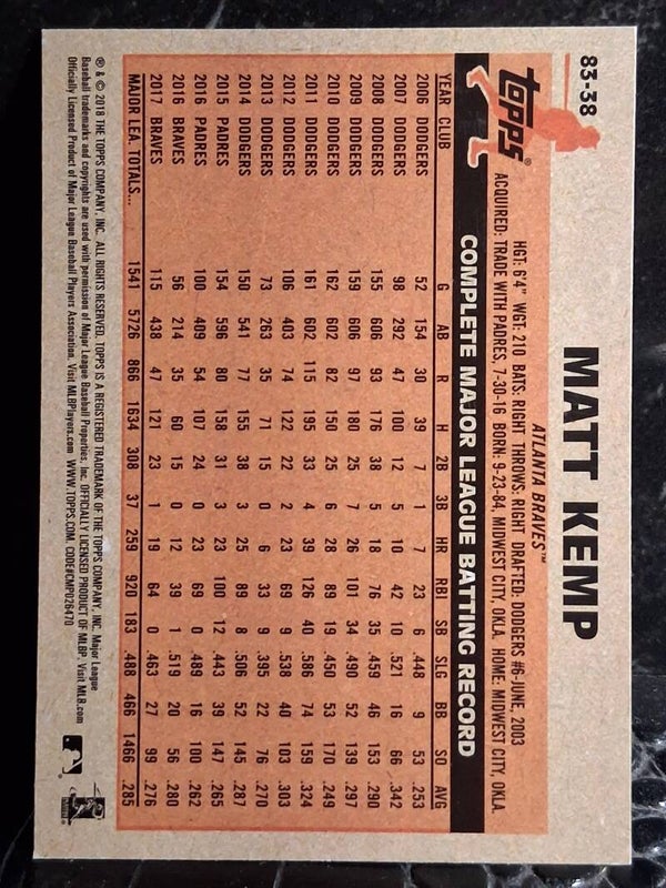 2018 Topps Matt Kemp #83-38 1983 Topps Baseball Atlanta Braves 10K