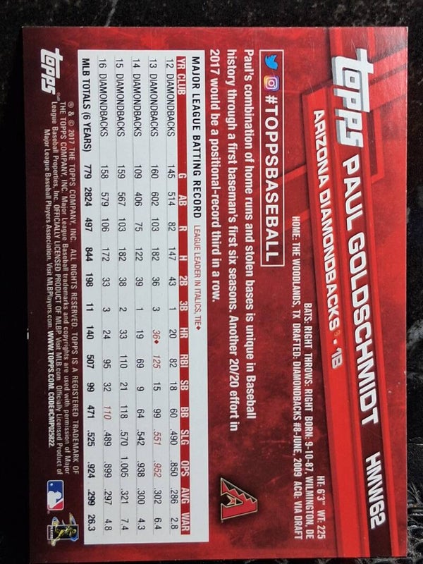 2017 Topps Holiday #HMW62 Paul Goldschmidt Card Arizona Diamondbacks