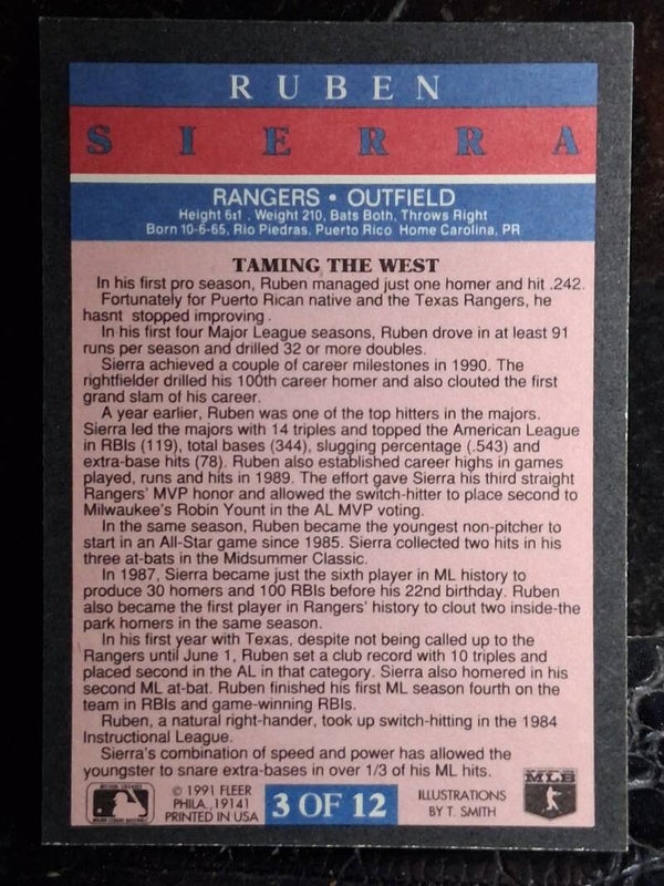 1991 Fleer Card, #3 Ruben Sierra, Texas Rangers Hall of Fame, Taming the West