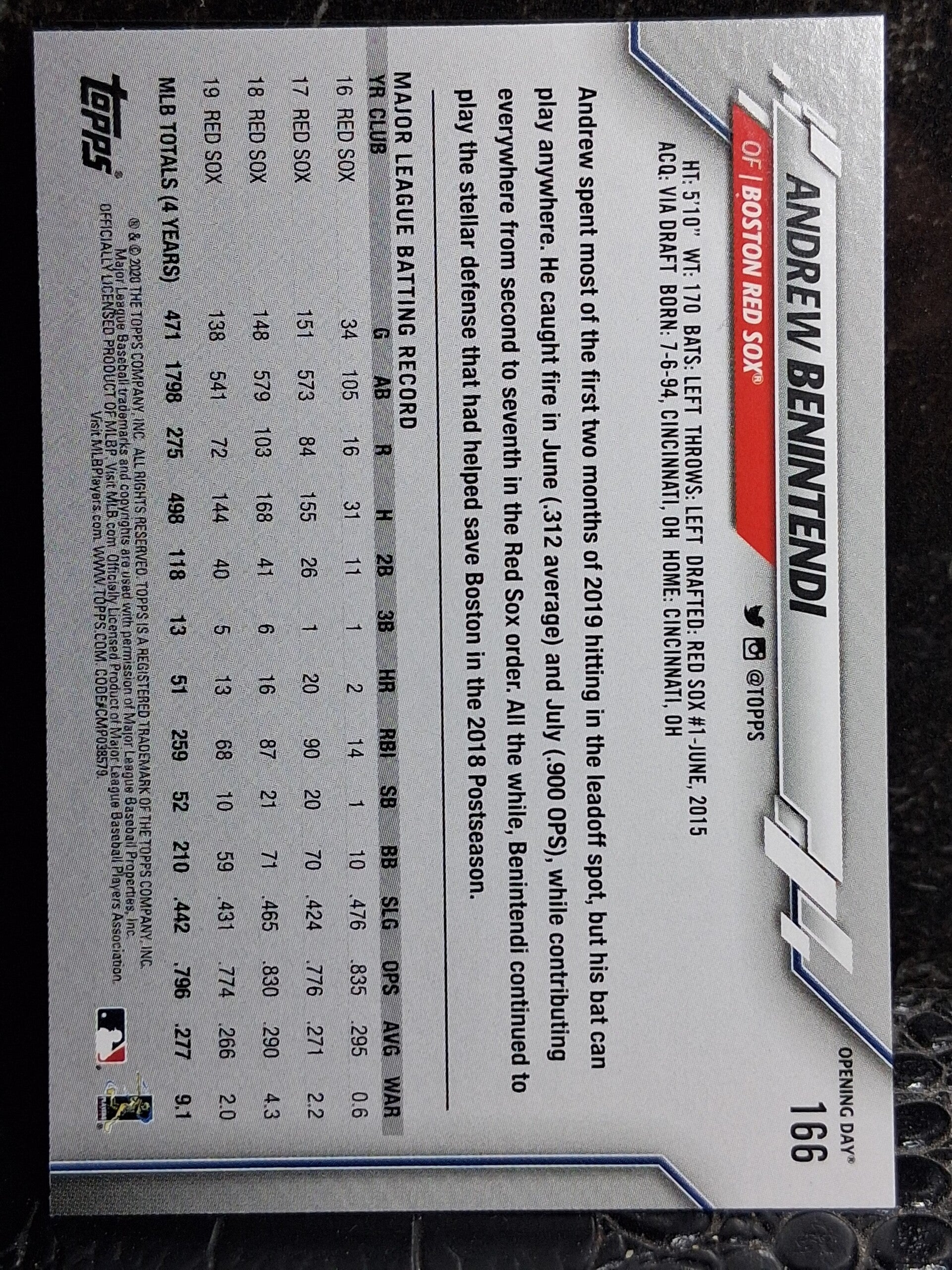 2020 Topps Opening Day Andrew Benintendi Boston Red Sox #166