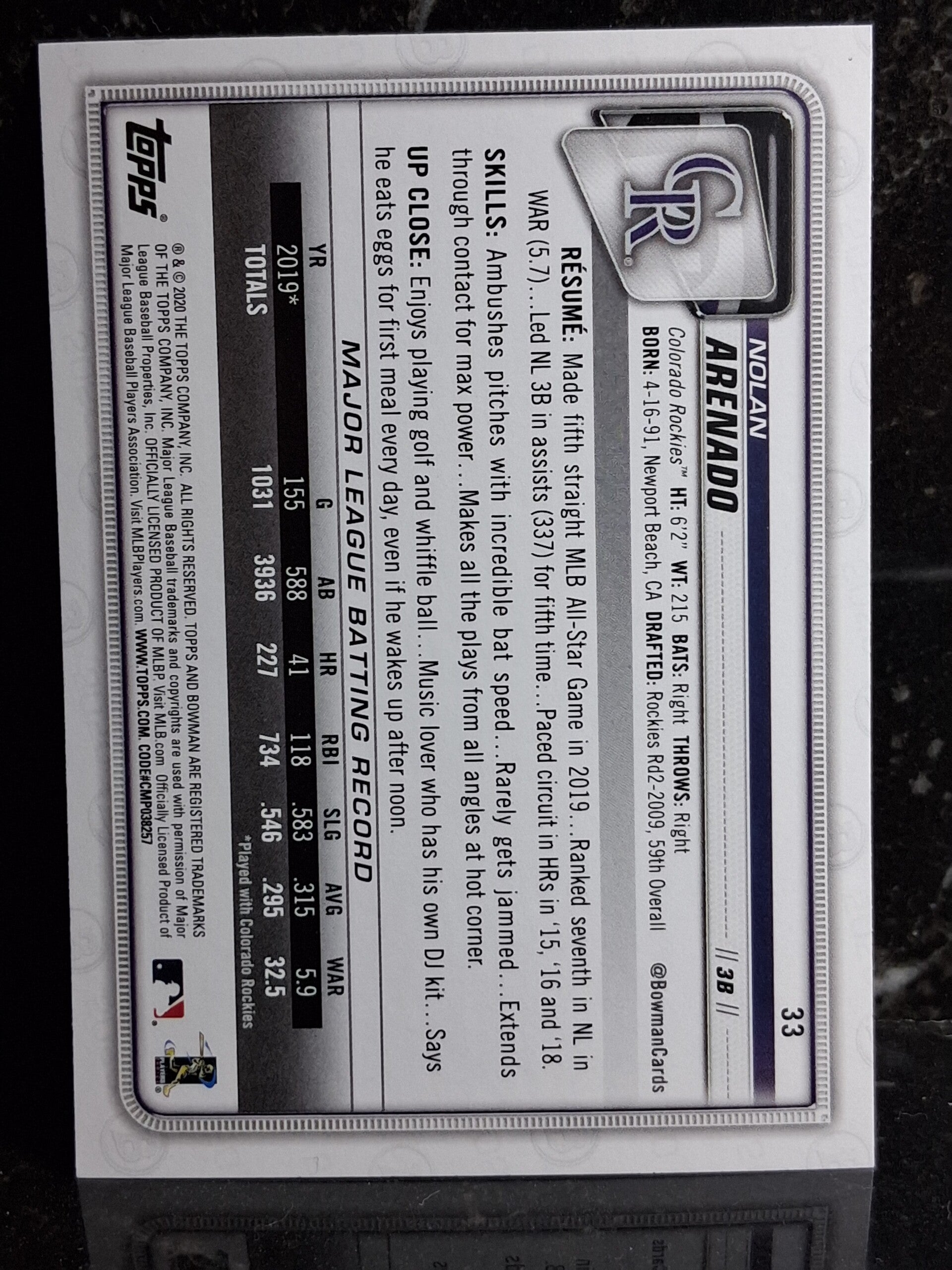 2020 Bowman Nolan Arenado #33 Colorado Rockies Baseball Card