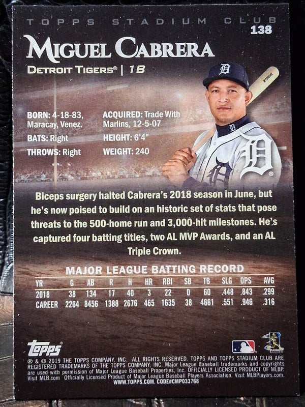 2019 Topps Stadium Club #138 Miguel Cabrera Detroit Tigers Baseball Card
