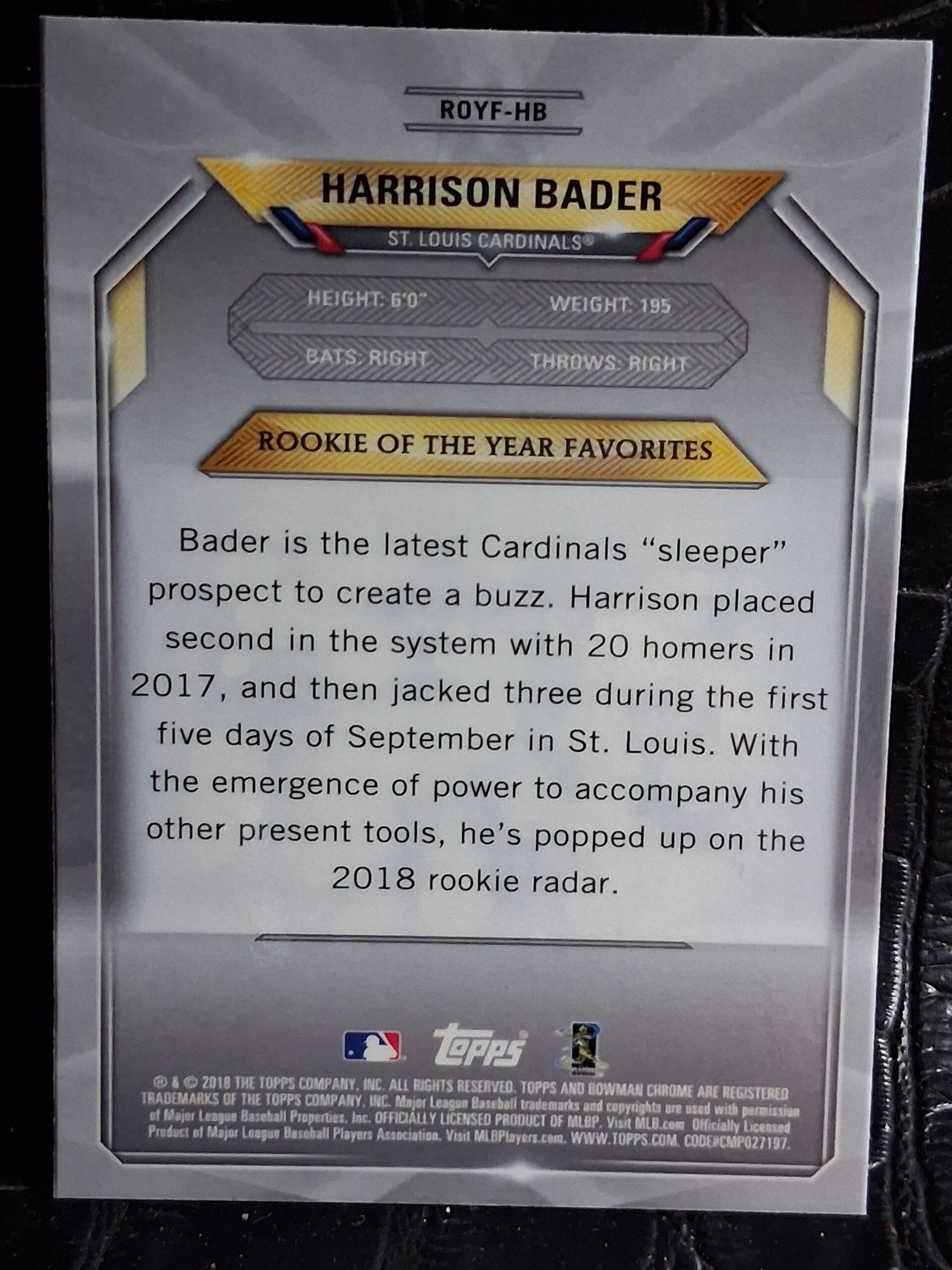 2018 Bowman #ROYF-HB Harrison Bader Chrome Rookie of the Year Favorites