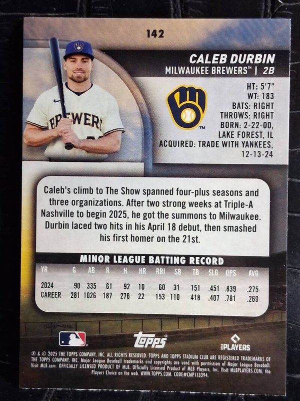 2025 Stadium Club Caleb Durbin #142 Rookie Brewers Baseball Card RC